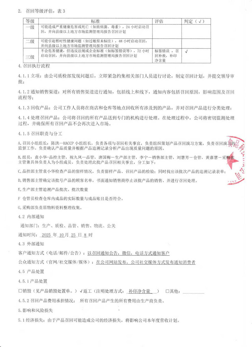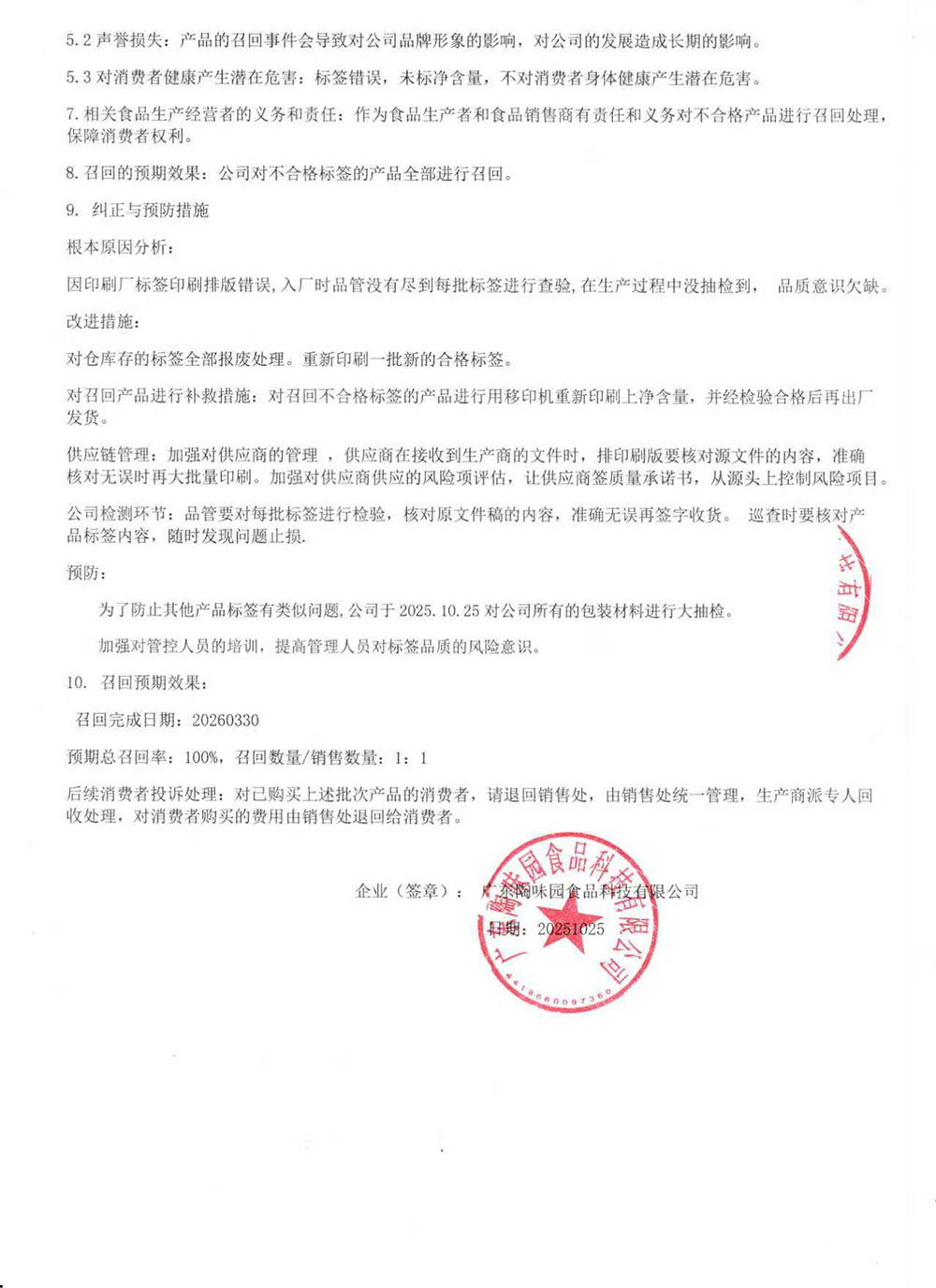 食品召回通知書